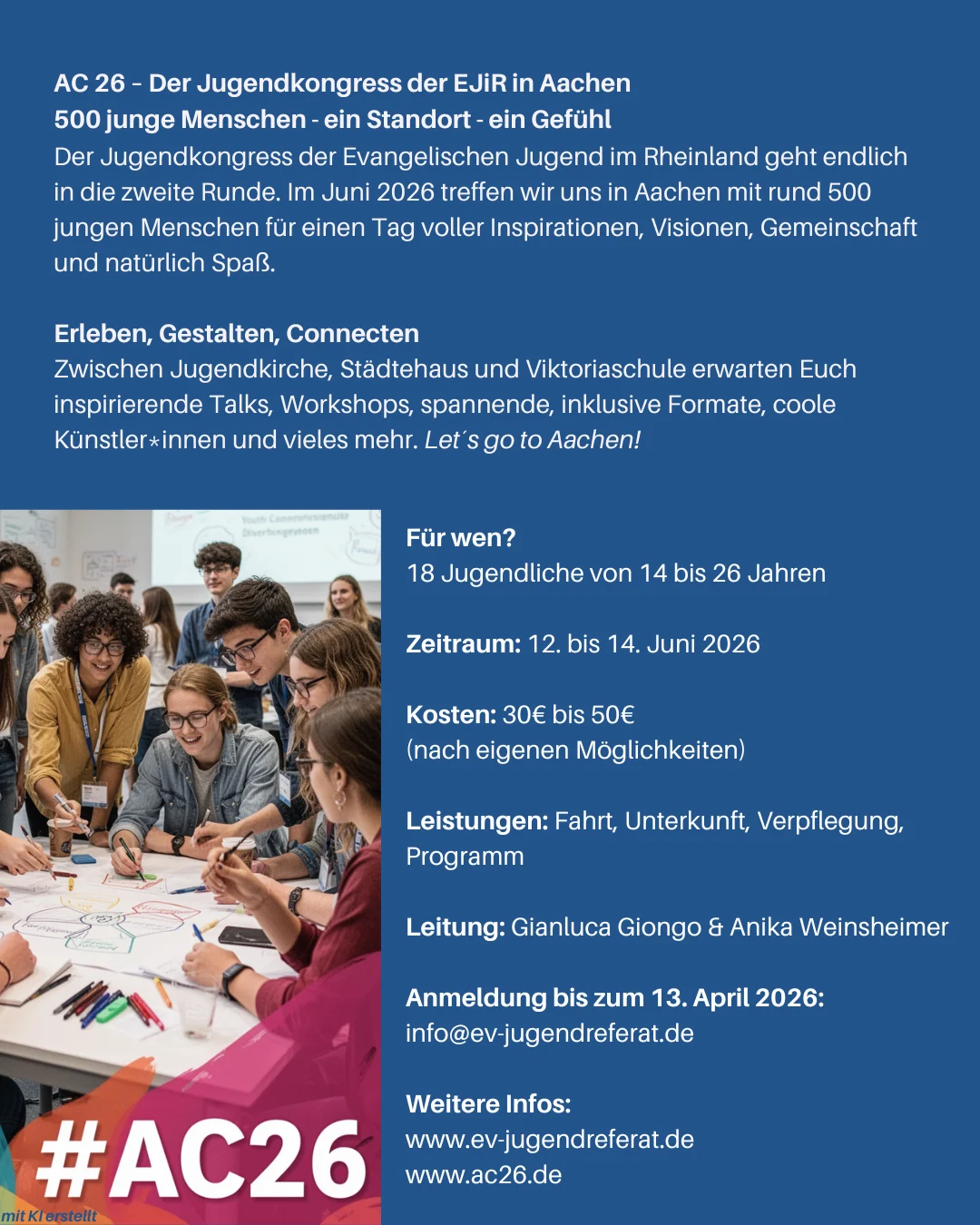 Der Jugendkongress der Evangelischen Jugend im Rheinland geht endlich in die zweite Runde. Im Juni 2026 treffen wir uns in Aachen mit rund 500 jungen Menschen für einen Tag voller Inspirationen, Visionen, Gemeinschaft und natürlich Spaß.